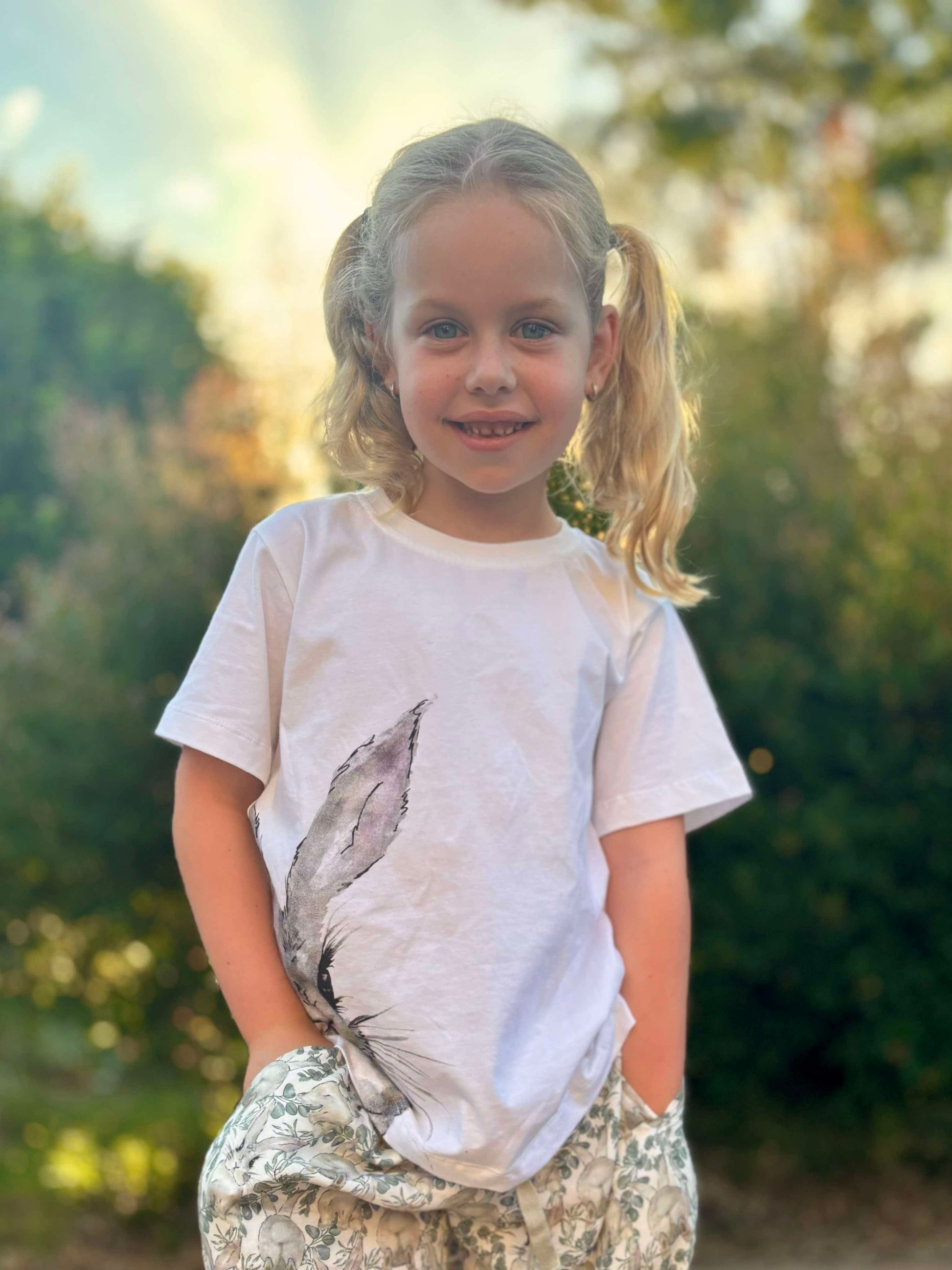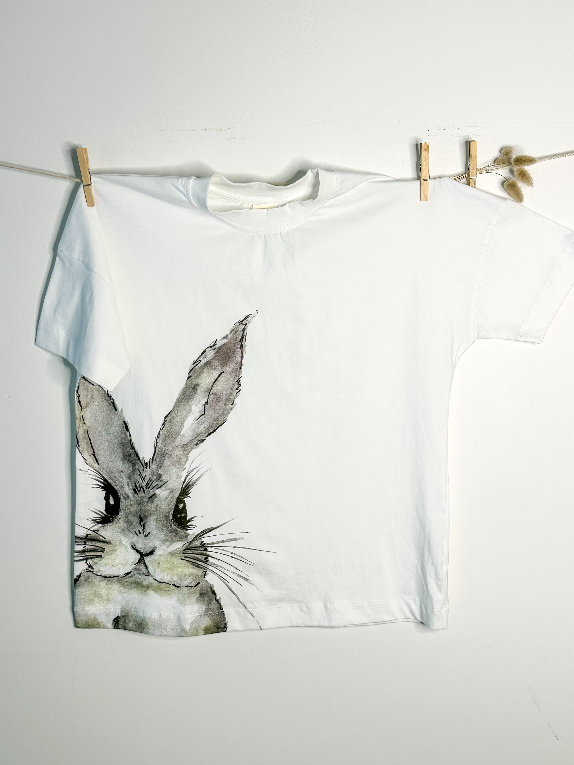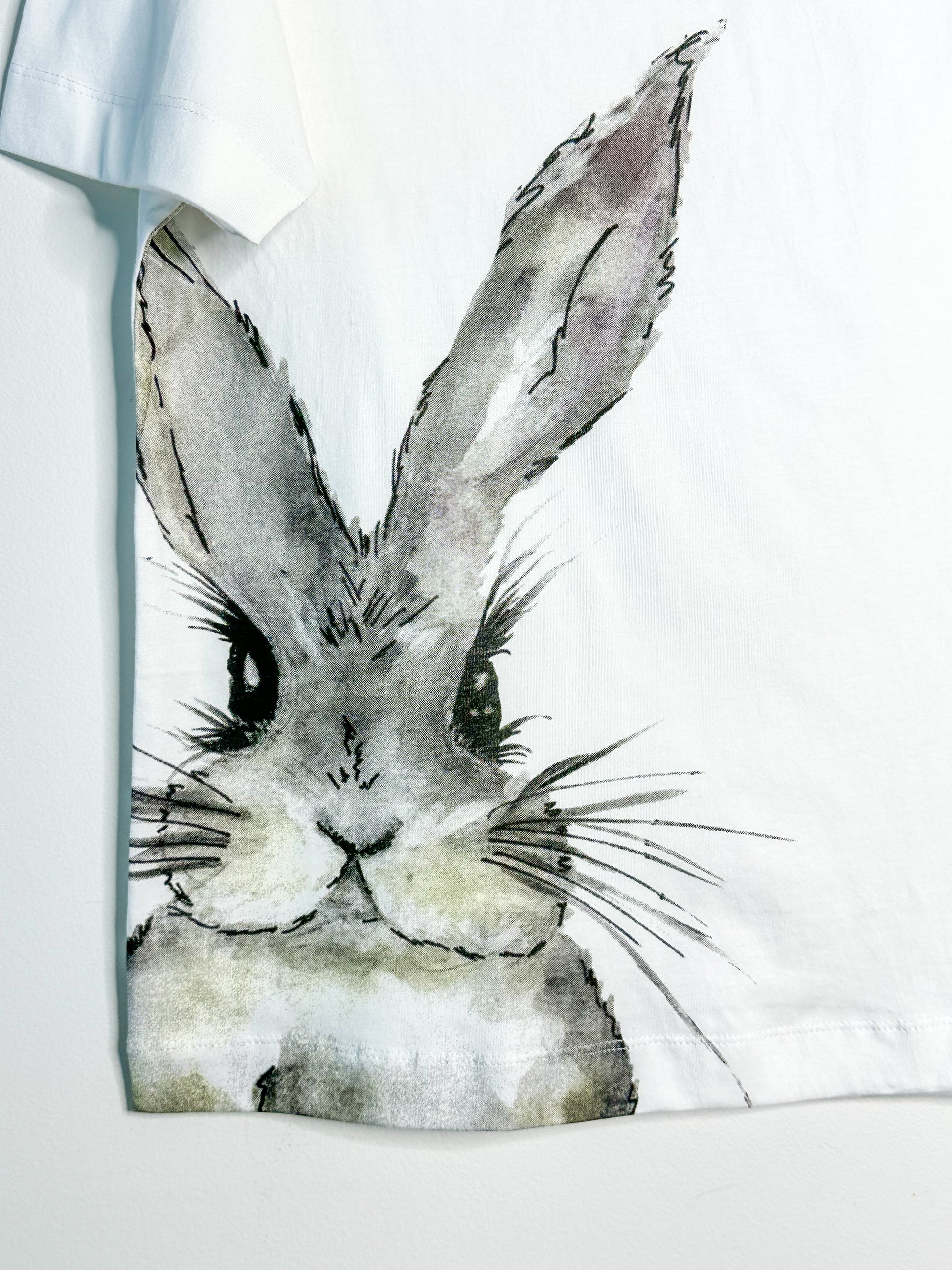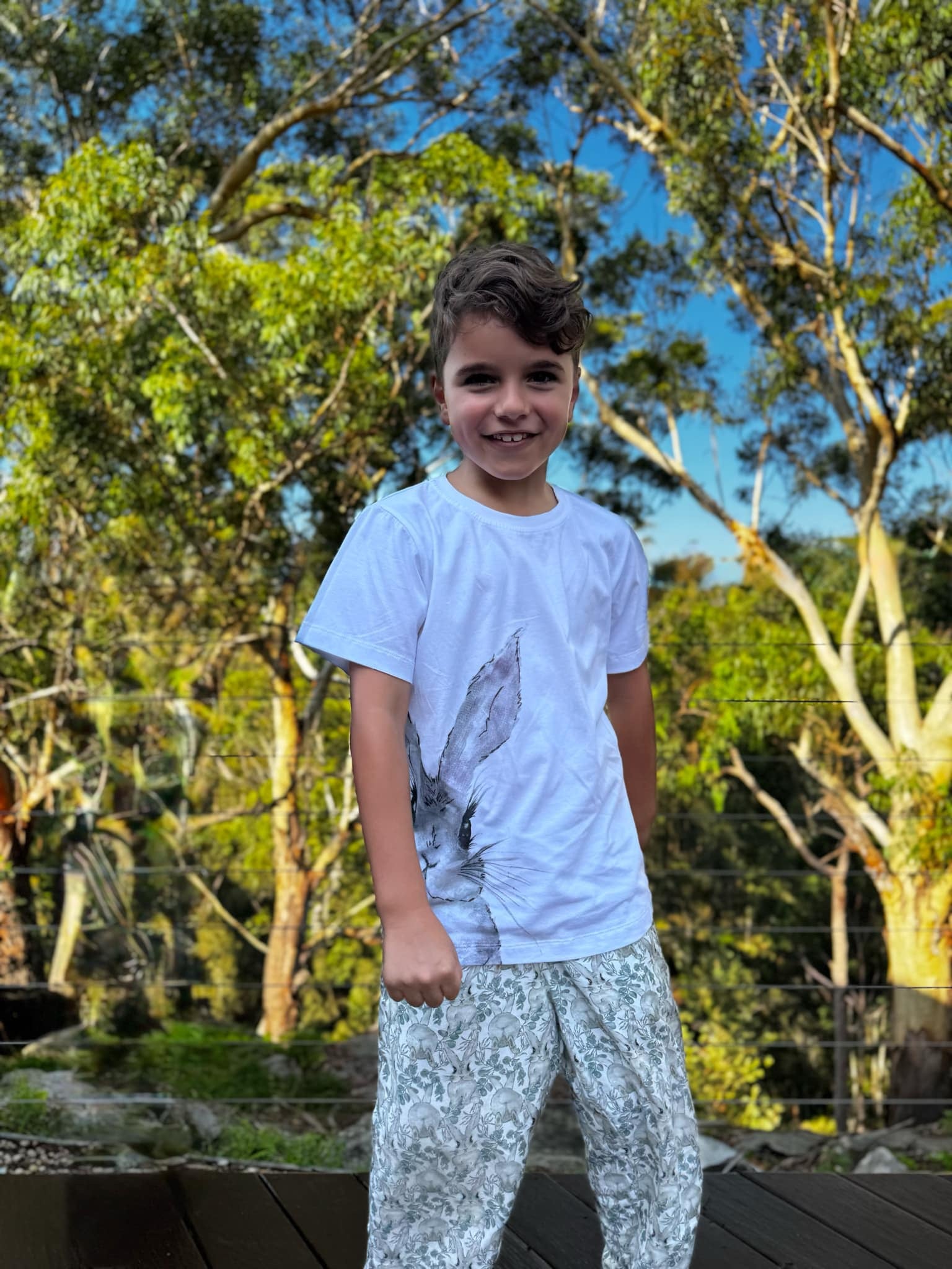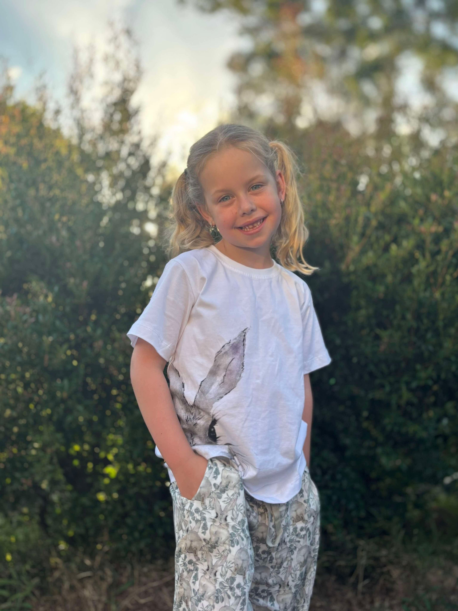 A sweet and timeless keepsake, this soft cotton t-shirt features a beautifully hand-painted bunny, printed with stunning detail on the side, filling about a third of the front. Designed for comfort and play, it's perfect for Easter celebrations and beyond. Pair it with our matching PJ pants for the full look