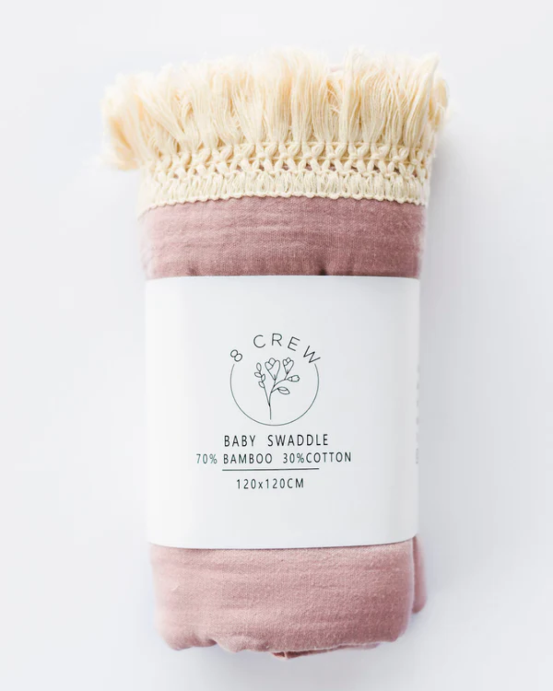 Wrap your little one in the luxurious comfort of our bamboo and cotton baby swaddle. This exquisite swaddle, featuring a delicate fringed design, offers both beauty and versatility.