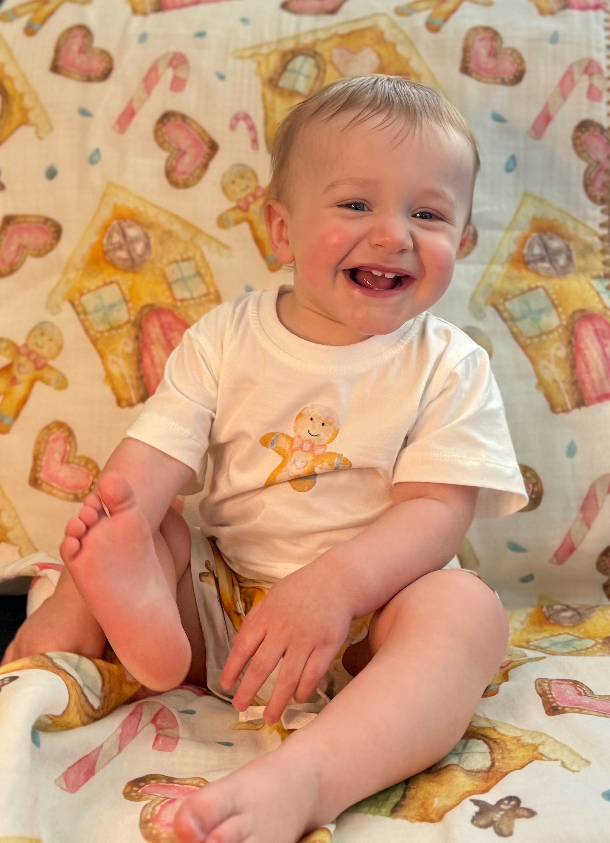 This adorable set features a cotton tee with a cheerful gingerbread man print and matching shorts in our exclusive Gingerbread Dreams pattern of houses, hearts, and candy canes. Designed to match perfectly with both our Men’s and Boys’ Gingerbread Dreams Sets, it’s ideal for creating those special family moments together at home or on holiday mornings.