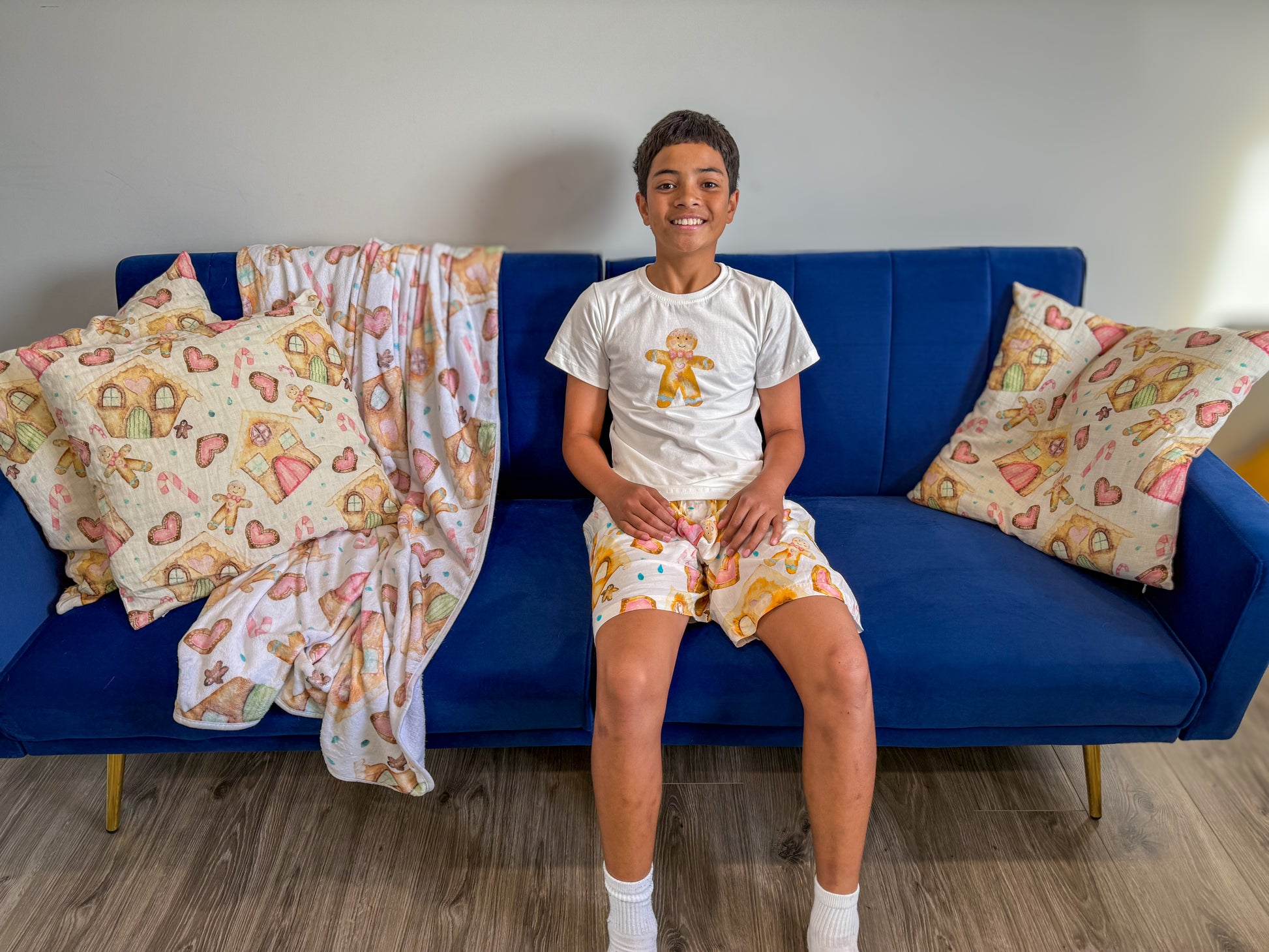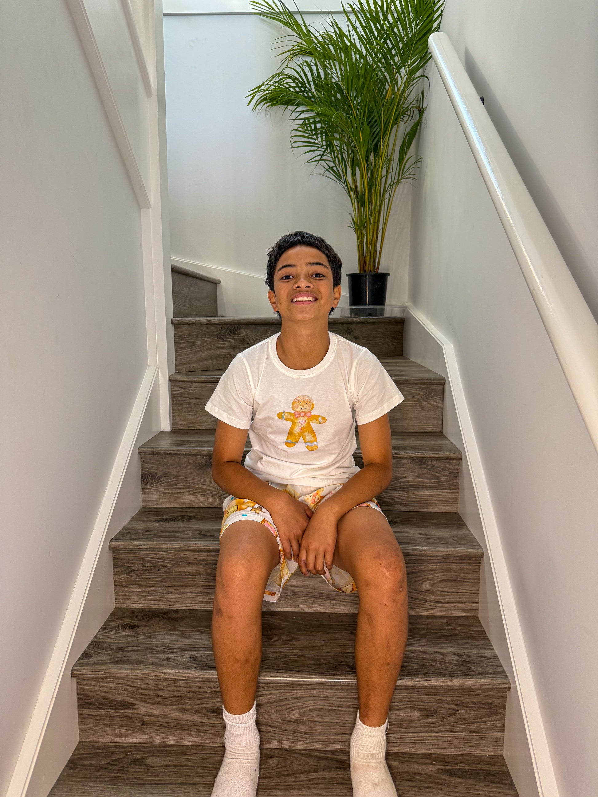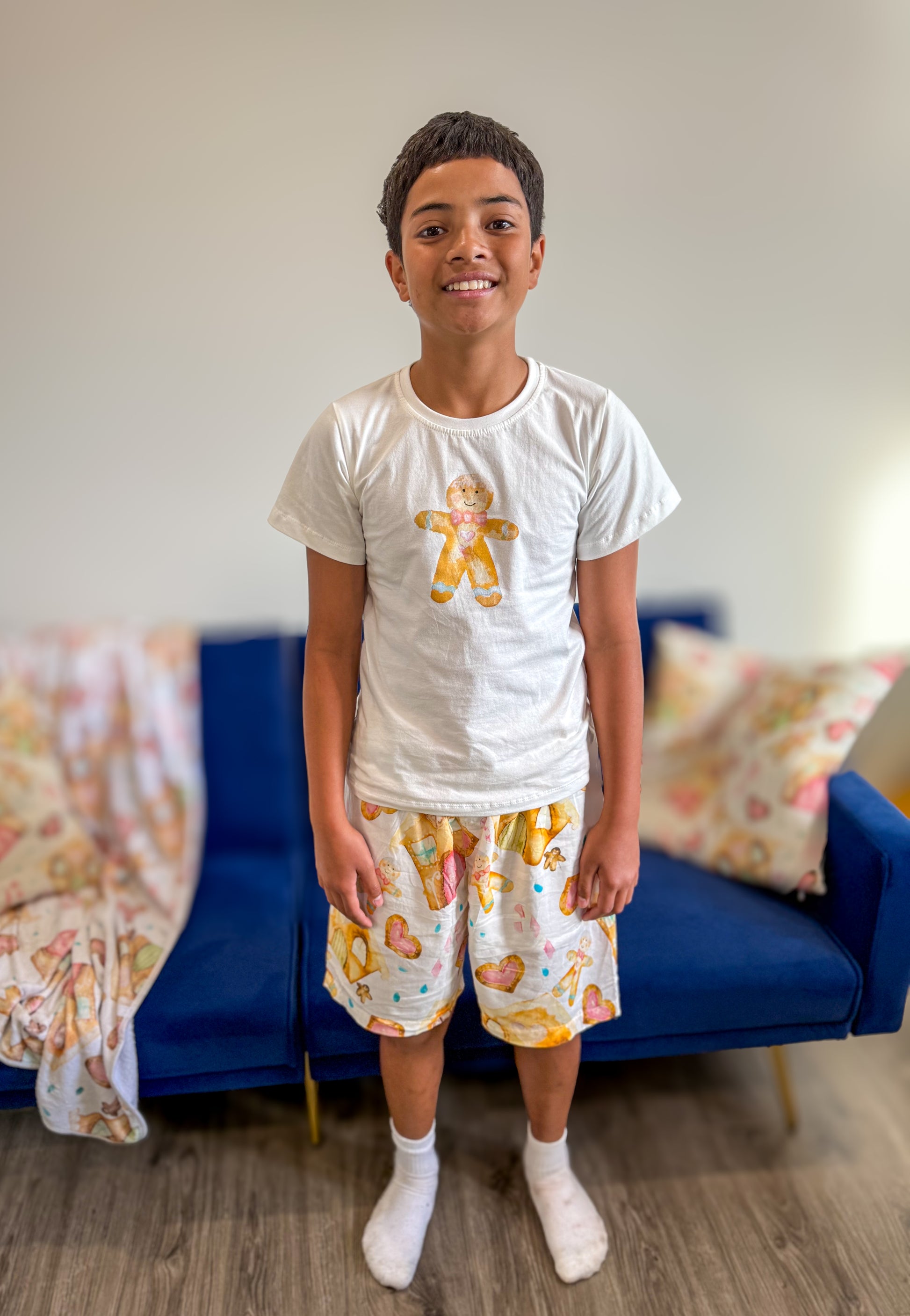 Featuring an adorable gingerbread tee and matching shorts covered in our exclusive Gingerbread Dreams print of houses, hearts, and candy canes, this set captures the joy of Christmas.