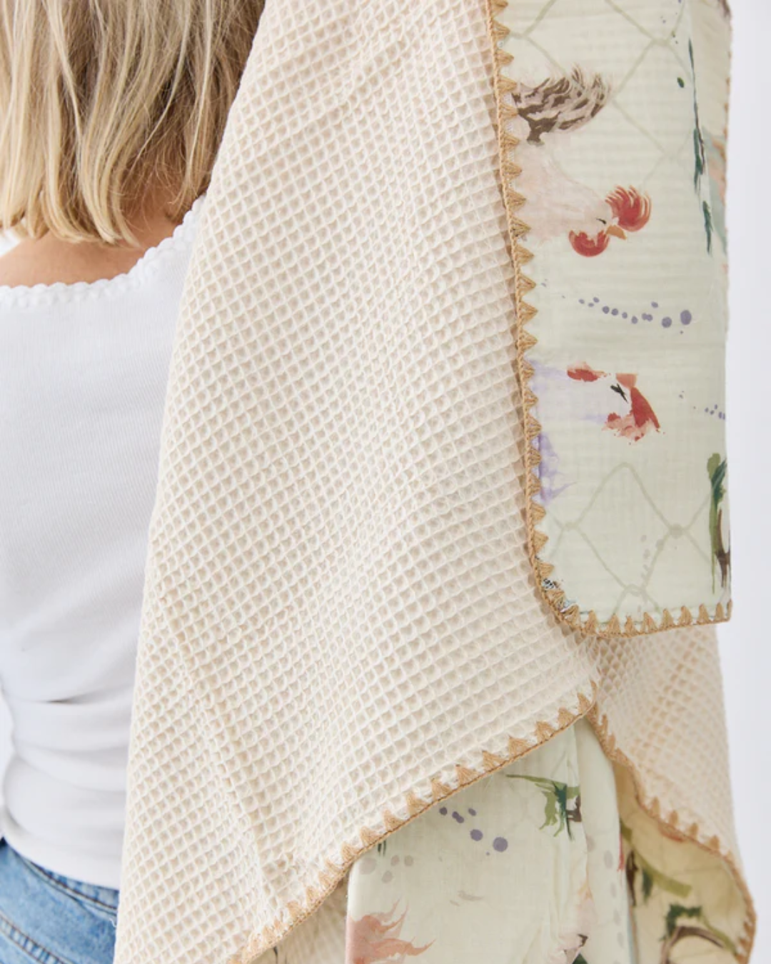 Wrap yourself in the comfort of our throw blanket, featuring waffle-backed muslin in 100% cotton, edged with a subtle blanket stitch.