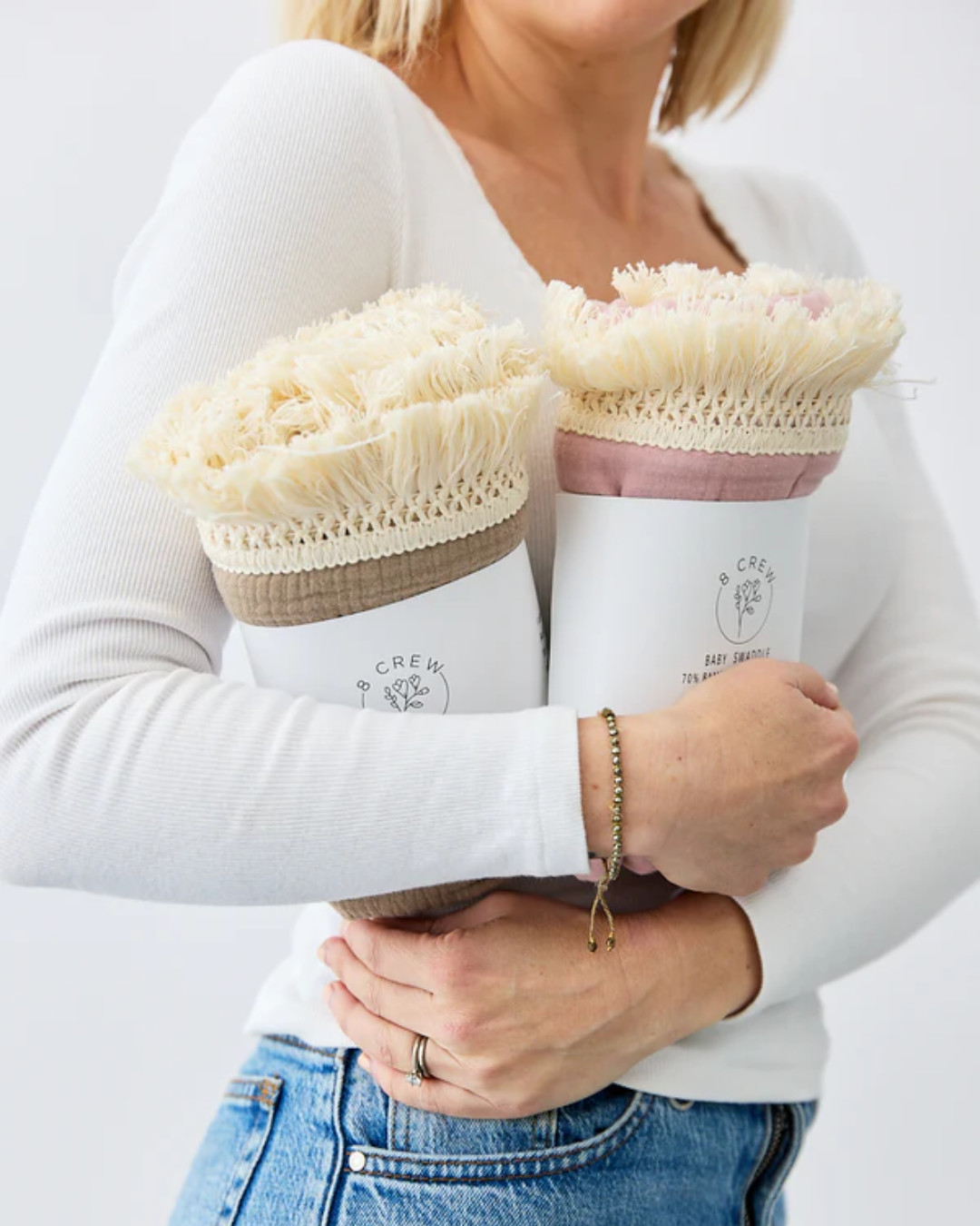 Wrap your little one in the luxurious comfort of our bamboo and cotton baby swaddle. This exquisite swaddle, featuring a delicate fringed design, offers both beauty and versatility.